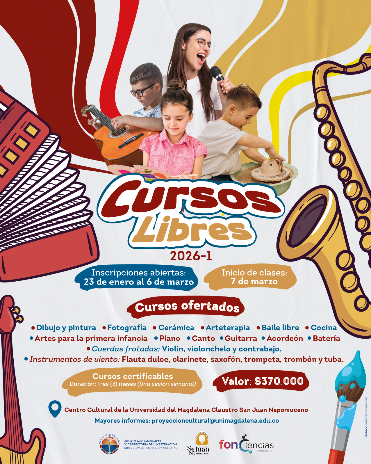 Los Cursos Libres de la Universidad del Magdalena son espacios de formación flexibles, diseñados para que niños, jóvenes, adultos y comunidad en general exploren, desarrollen y fortalezcan habilidades en áreas artísticas, culturales, musicales, creativas y de interés personal.