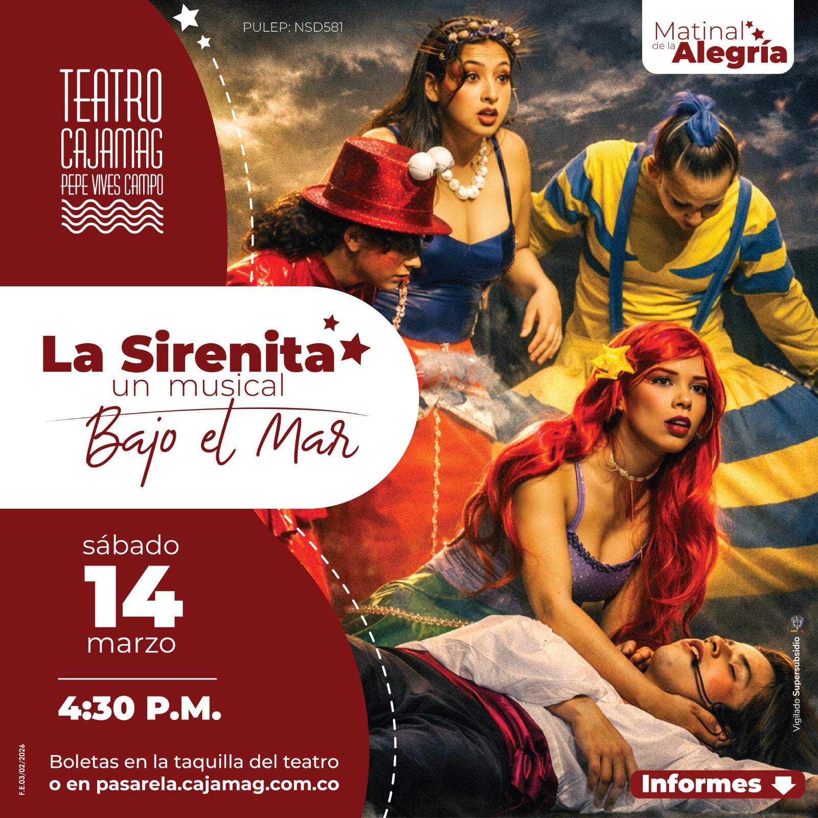 Prepárate para vivir una tarde mágica llena de música, color y fantasía junto a toda la familia. Sumérgete en esta hermosa historia que encantará a grandes y chicos. Boletas disponibles Taquilla del teatro pasarela.cajamag.com.co Cat. A: $15 mil. Cat. B: $20 mil. Cat. C: $52 mil. Cat. D: $58 mil.
