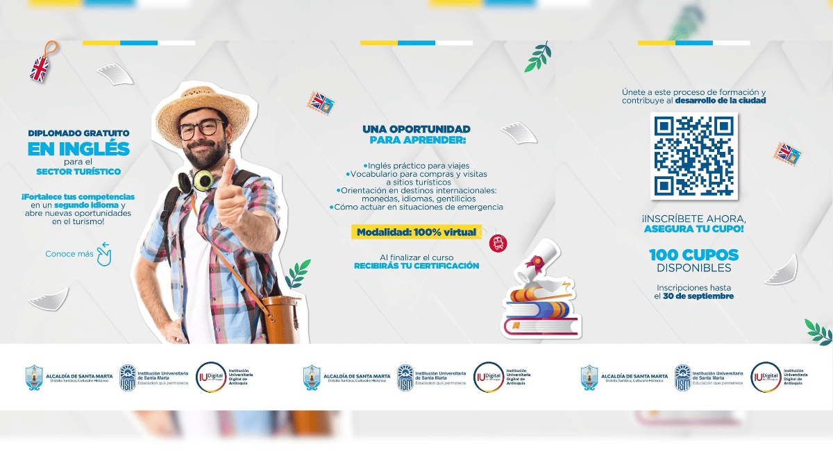 turismoInglésDiplomado virtualformación profesionalSanta MartaPublicidad Alcaldía de Santa Martala samariaDurante un mes, los participantes podrán acceder a 144 horas de clases virtuales orientadas a impulsar su crecimiento laboral y académico.Visible: Síromanmedrano