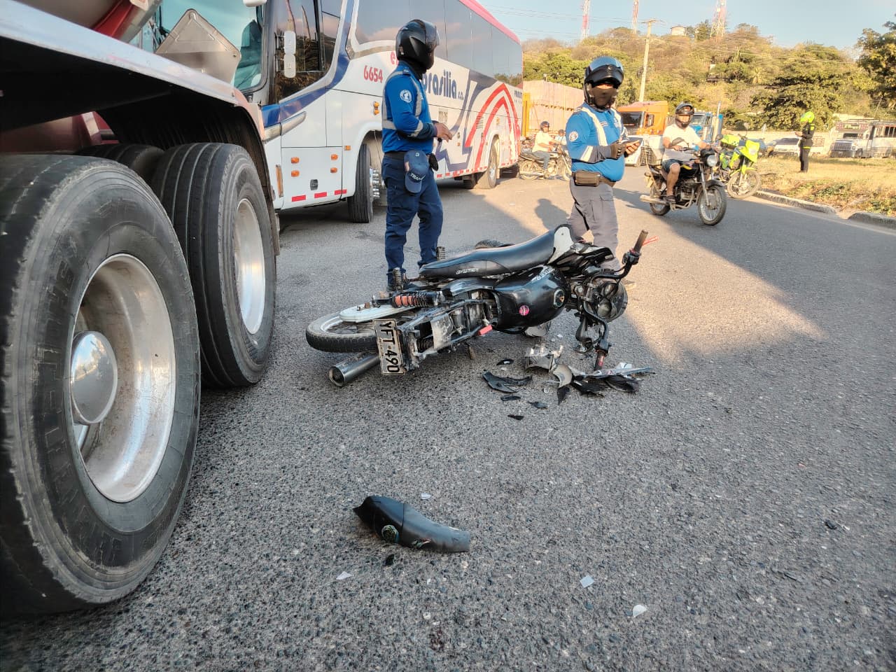 De acuerdo con versiones preliminares, el camión salía de la planta de Bavaria y ya se encontraba incorporado a la vía cuando su conductor sintió un fuerte golpe. Al parecer, el motociclista impactó contra el vehículo pesado, provocando que la motocicleta quedara tendida sobre el asfalto con severos daños en su estructura.