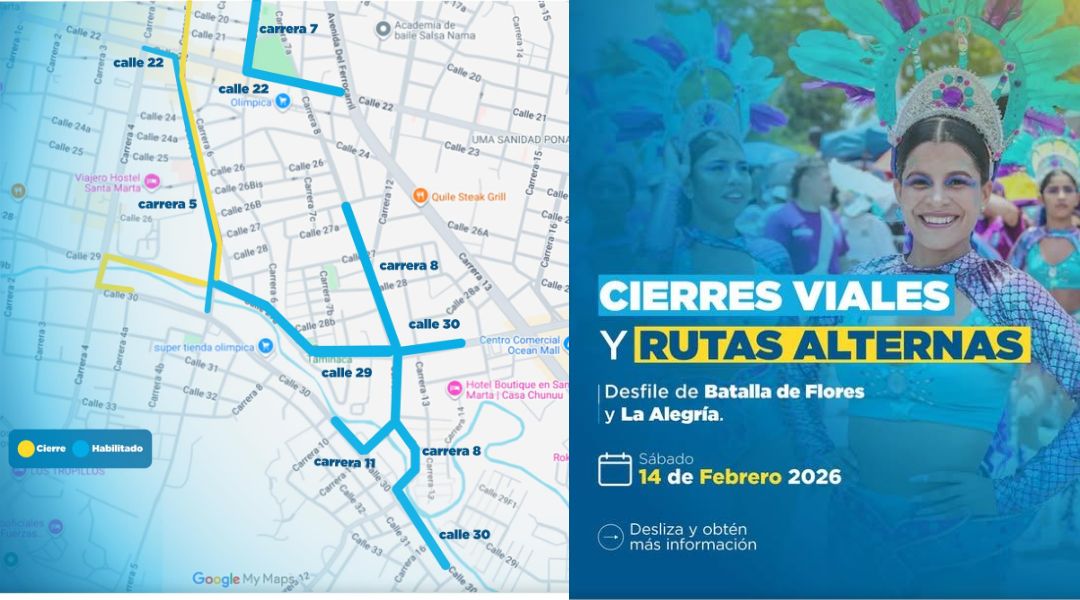 El evento se realizará este sábado 14 de febrero. La Alcaldía de Santa Marta anunció cierres totales y progresivos en distintos puntos de la ciudad para este sábado 14 de febrero, con motivo de los desfiles de Batalla de Flores y La Alegría. Estas medidas incluyen la implementación de rutas alternas. Las disposiciones buscan […]