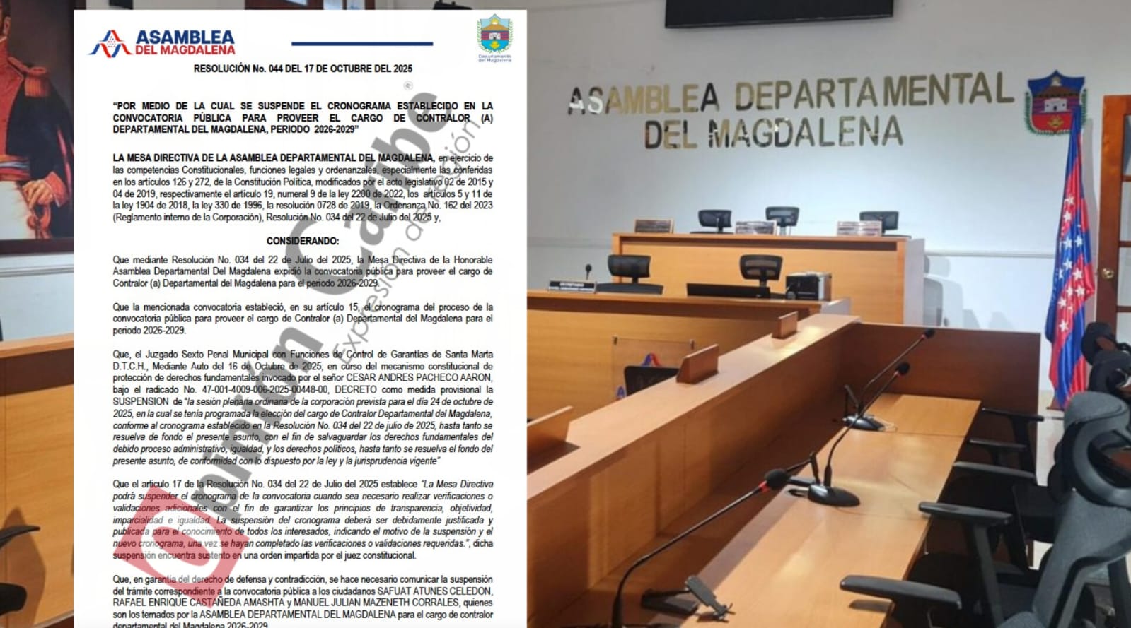 Esto se da tras una medida provisional del Juzgado de Santa Marta que detuvo el proceso, el cual se encontraba en su etapa final, luego de una acción judicial interpuesta por César Pacheco Aarón. Por: Arnol Sarmiento La Asamblea Departamental del Magdalena suspendió el proceso de elección del Contralor Departamental para el periodo 2026–2029, en […]