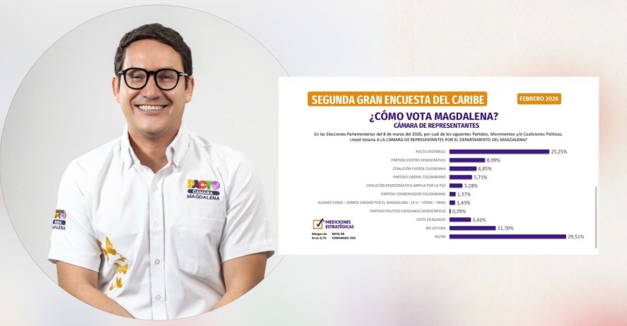 Viernes 27 de Febrero de 2026 – 3:49pmLa más reciente encuesta de Medición Estratégica revela que la lista del Pacto Histórico a la Cámara de Representantes ostenta una intención de voto del 25,25%, posicionándose como la opción favorita de los magdalenenses de cara a las elecciones del 8 de marzo de 2026.