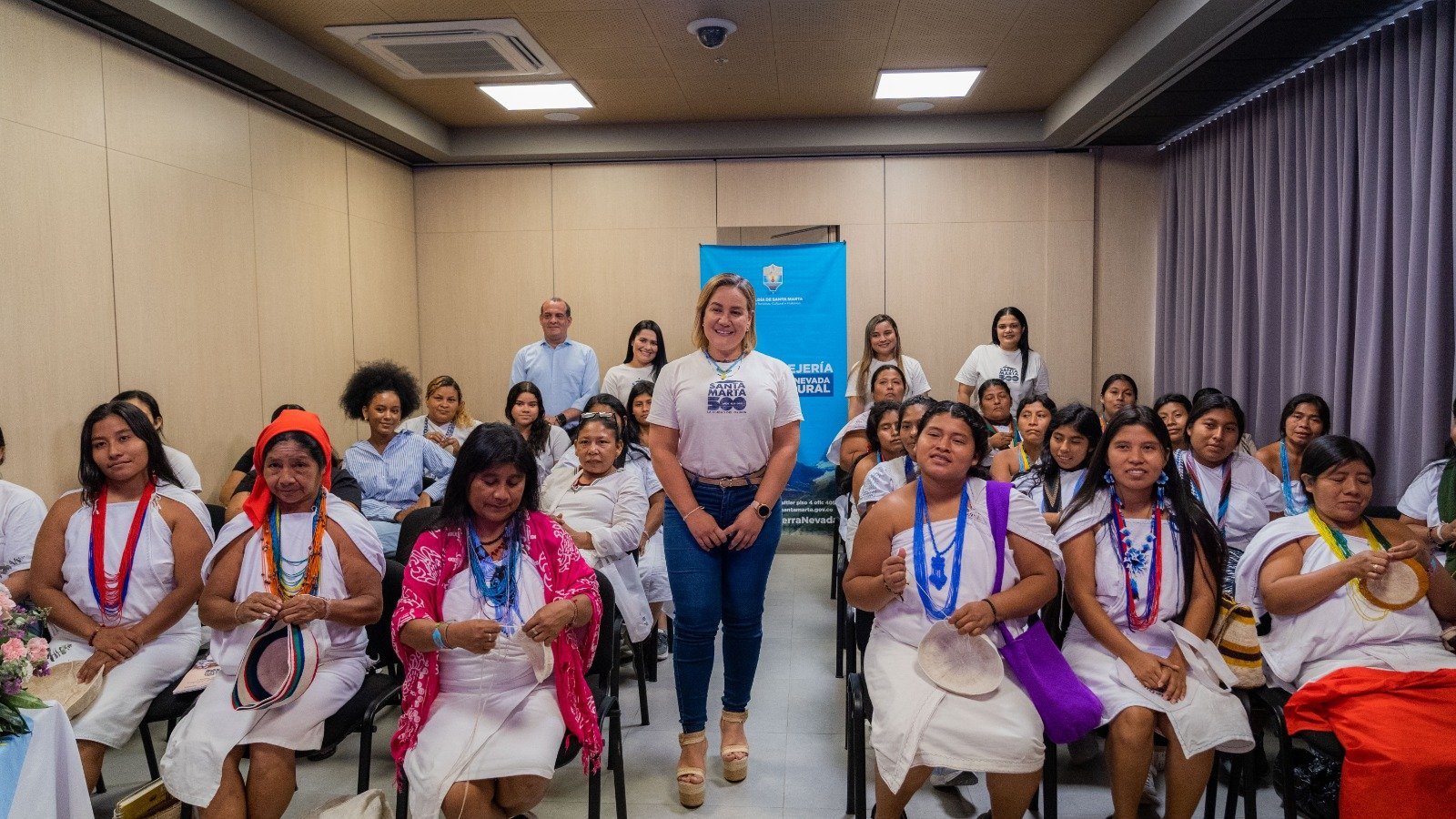Por tal motivo, en una jornada especial a través del programa ‘Tejiendo Historia 500+’ se realizó un proceso de capacitación a sesenta mujeres pertenecientes a los pueblos Kogui, Arhuaco, Malayo, Wiwa, Kankuamo, Ette Ennaka, Wayuu e Inga, esta última comunidad proviene del Putumayo con presencia en nuestra zona rural.