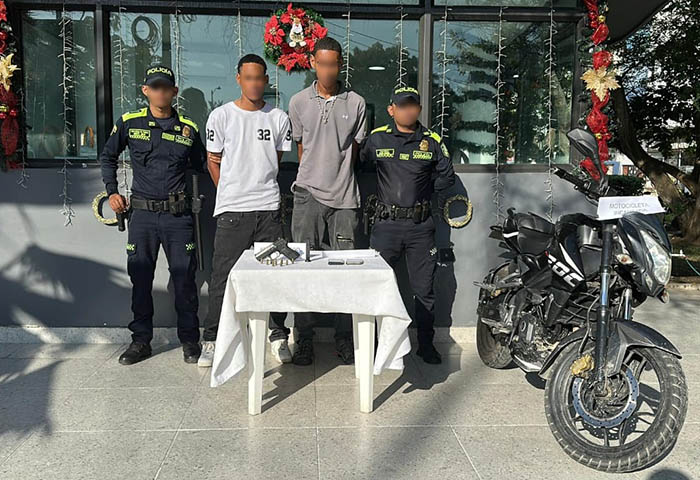 De acuerdo con el reporte oficial, la intervención se produjo gracias a la rápida reacción de las patrullas de vigilancia, que interceptaron a los sujetos cuando se desplazaban en una motocicleta. Durante el procedimiento, los uniformados hallaron en su poder una pistola calibre 9 milímetros, un cargador y nueve cartuchos.