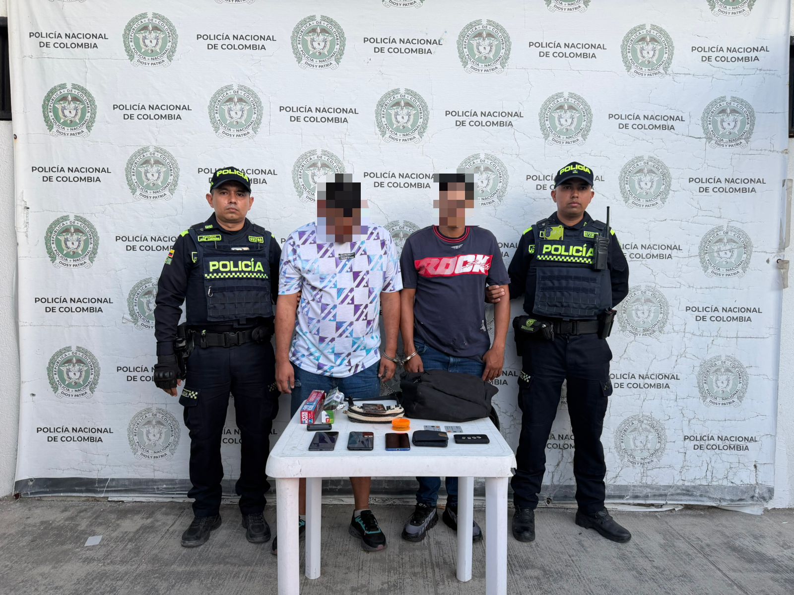 En un segundo operativo, realizado en Santa Marta, uniformados del Modelo del Servicio de PolicÃa Orientado a las Personas y los Territorios lograron la captura en flagrancia de dos hombres señalados de cometer un hurto. La acción fue posible gracias a la oportuna información suministrada por la vÃctima, lo que permitió una rápida reacción de las patrullas.