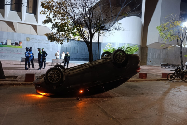En horas de la madrugada de este sábado se registró un aparatoso accidente de tránsito en la Plaza Bolívar, específicamente en la Calle de la Cárcel (calle 14), frente al Banco de la República, cuando un automóvil terminó volcado tras colisionar contra uno de los bordillos ubicados en este emblemático sector del Centro Histórico.