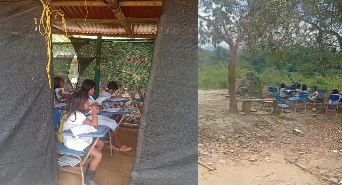 Allí, la institución se resume a unos cuantos pupitres en una especie de choza, donde una malla hace de las veces de pared.