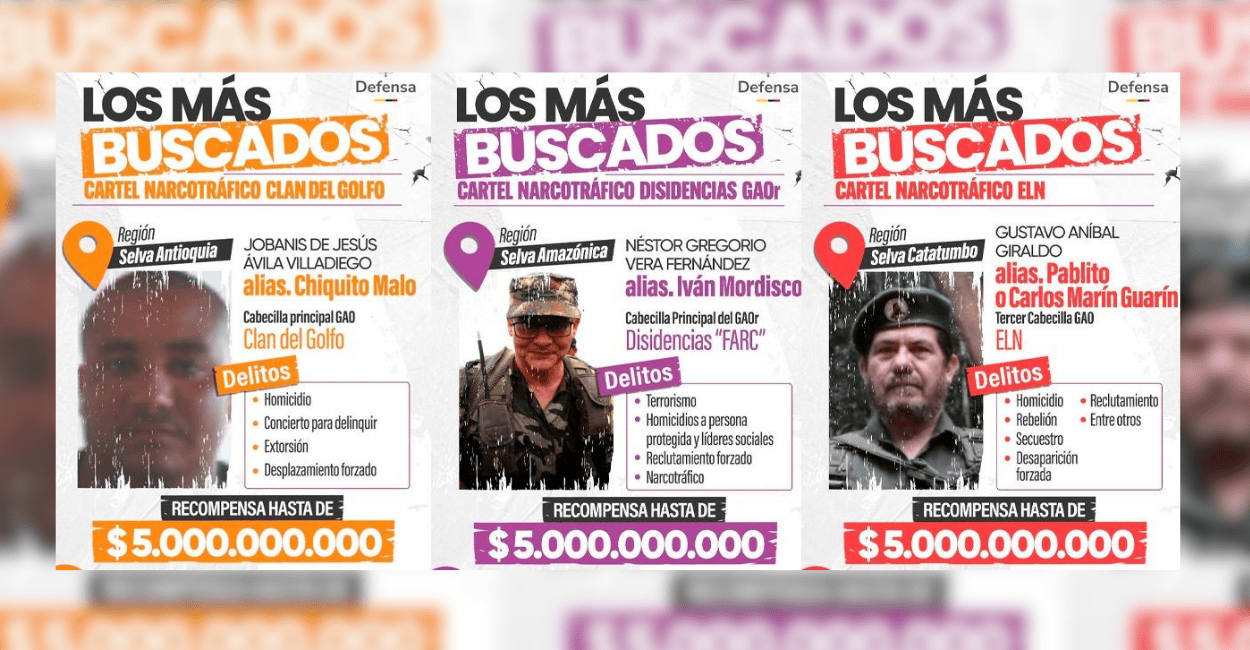 “Colombia y los Estados Unidos han priorizado de manera conjunta una serie de objetivos de alto valor, conforme a la ley. Algunos de ellos son: Alias ‘Pablito’, cabecilla del cartel del ELN. Recompensa hasta $5.000 millones. Orden de captura vigente. Alias ‘Mordisco’ cabecilla de las disidencias criminales. Recompensa hasta $5.000 millones. Orden de captura vigente”.