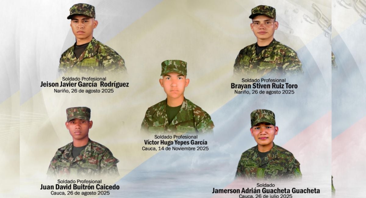 Los solados Jeison Jarvier García, Brayan Stiven Ruiz Toro, Juan David Buitron Caicedo fueron secuestrados en Nariño el pasado 26 de agosto de 2025; mientras que Víctor Hugo Yepes García, el 14 de noviembre en Cauca.