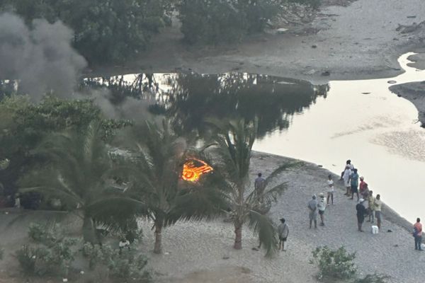 En imágenes captadas desde el sector se observa un foco de fuego activo cerca de palmeras y vegetación ribereña, con una columna de humo visible y varias personas alrededor del sitio, a pocos metros del cuerpo de agua y del ecosistema de manglar.