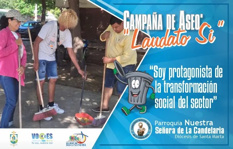 Santa Marta, 1 de octubre de 2025. La Parroquia Nuestra Señora de La Candelaria, junto a la Emisora Comunitaria Voces 89.4 F.M. y líderes sociales de los barrios María Eugenia, Las Américas, Primero de Mayo, Pastrana y La Victoria, convocan a la ciudadanía a participar en la Campaña de Aseo “Laudato Si”, que se llevará a cabo este sábado 4 de octubre, de 7:00 a 10:00 de la mañana.