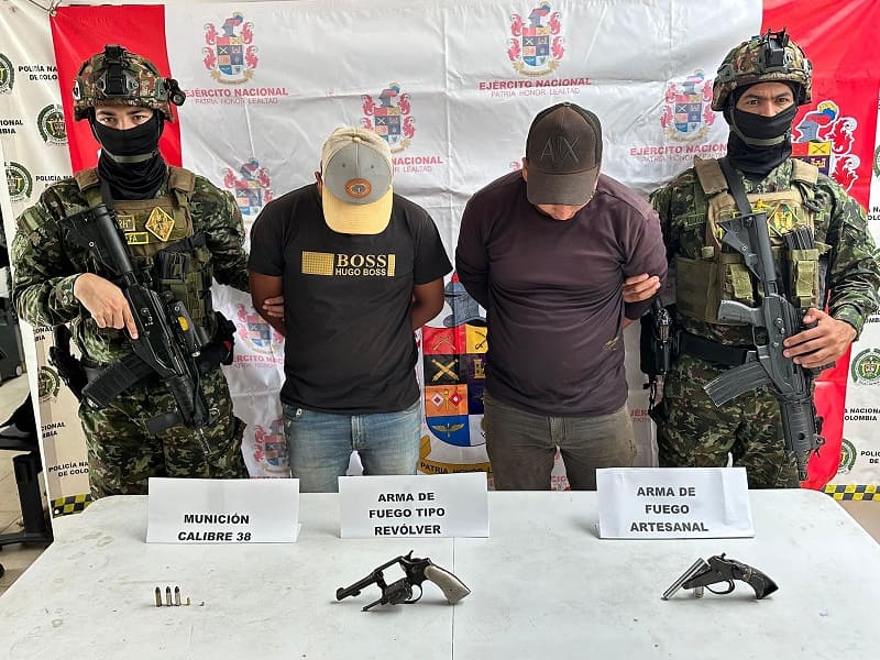 El procedimiento se llevó a cabo en la vereda Altamira, durante un puesto de control, donde fueron capturados dos ciudadanos, a quienes se les halló un revólver, un arma de fabricación artesanal y 3 cartuchos calibre 38 mm.