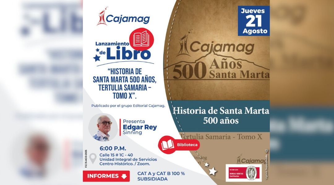 En el marco de la conmemoración de los 500 años de fundación de la capital del Magdalena, el Grupo Editorial Cajamag presentará el libro “Historia de Santa Marta 500 años, Tertulia Samaria – Tomo X”, una obra que recoge la memoria, el legado cultural y la esencia de la ciudad más antigua de Colombia. El […]