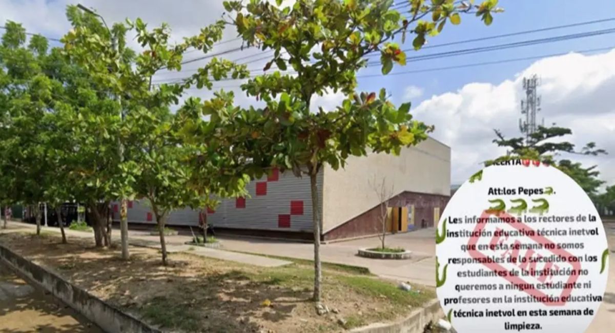 “Les informamos a los rectores de la institución educativa técnica INETVOL que en esta semana no somos responsables de lo sucedido con los estudiantes de la institución. No queremos a ningún estudiante ni profesores en la institución en esta semana de limpieza. Att: Los Pepes”, decía el falso panfleto que atemorizó a toda la comunidad educativa.