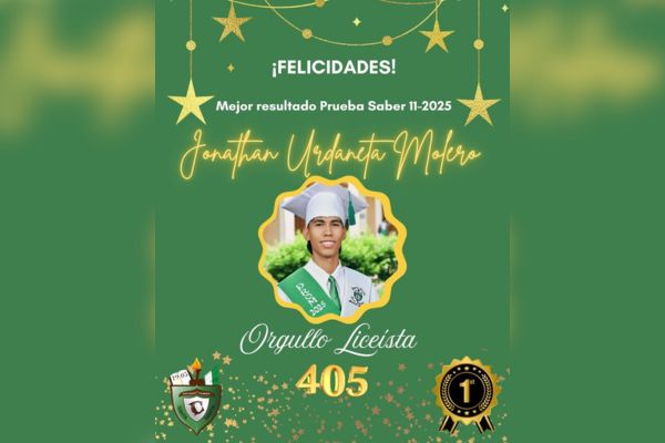 El Instituto Educativo Distrital Liceo Celedón celebra el destacado logro académico de Jonathan Urdaneta Molero, quien obtuvo uno de los tres mejores puntajes del Distrito de Santa Marta en las Pruebas de Estado ICFES 2025.