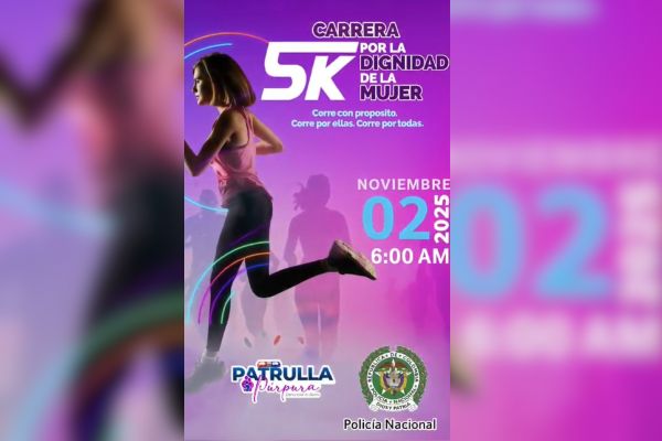 La Policía Nacional, a través de la Patrulla Púrpura, invita a la comunidad del municipio de Fundación, Magdalena, a participar en la ‘Carrera 5K por la Dignidad de la Mujer’, que se llevará a cabo el sábado 2 de noviembre desde las 6:00 de la mañana, con punto de encuentro en el parque 7 de Agosto.