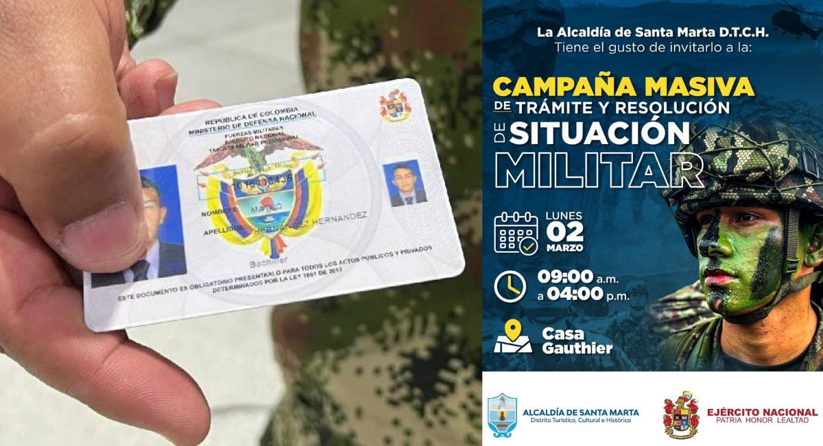 Lunes 02 de Marzo de 2026 – 10:24amCon el objetivo de facilitar a los jóvenes samarios el trámite y resolución de su actualidad militar, la Alcaldía Distrital de Santa Marta a través de la Secretaría de Seguridad y Convivencia, en articulación con el Ejército Nacional, realizará este lunes 2 de marzo una campaña masiva de trámite y resolución de situación militar.