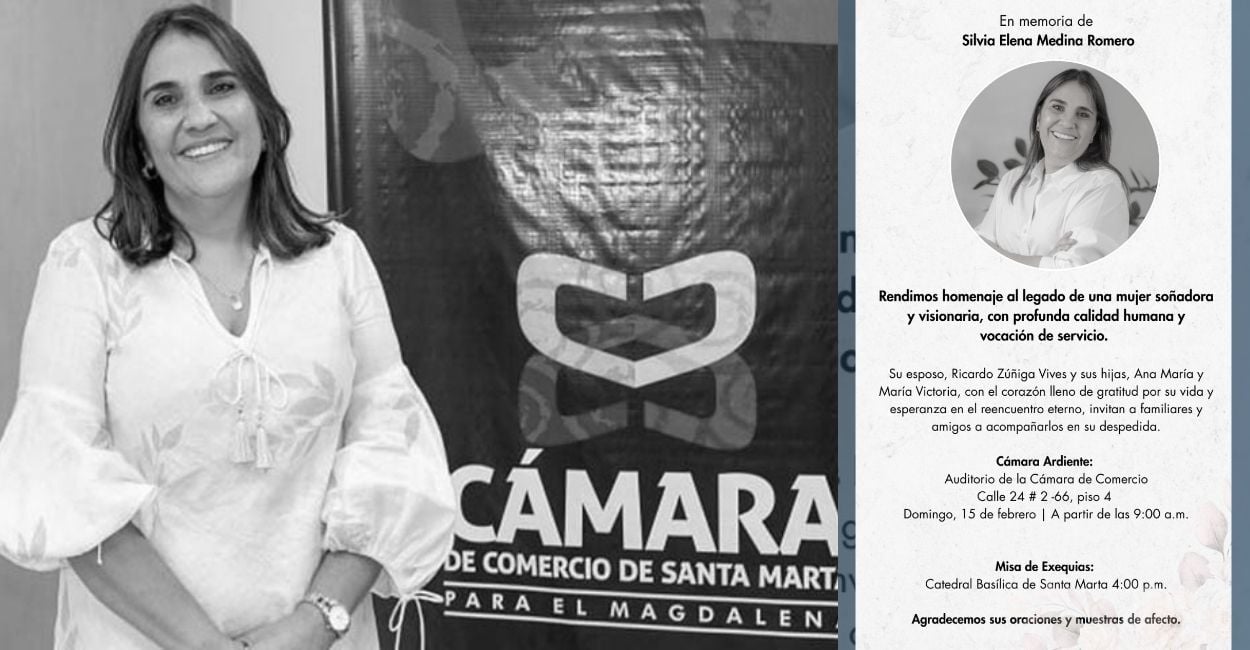 Sábado 14 de Febrero de 2026 – 12:16pmLa familia de Silvia Elena Medina Romero confirmó los detalles de las ceremonias de despedida para la presidenta ejecutiva de la Cámara de Comercio de Santa Marta para el Magdalena. Su esposo, Ricardo Zúñiga y sus hijas Ana María y María Victoria invitan a familiares y amigos a acompañarlos en este momento de dolor, agradeciendo las muestras de afecto recibidas durante estas horas difíciles.