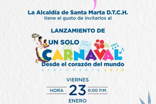 La Alcaldía de Santa Marta realizará este viernes 23 de enero de 2026, a las 6:00 de la tarde, el lanzamiento oficial de ‘Un Solo Carnaval: Desde el corazón del mundo’, una apuesta cultural que unifica las expresiones festivas de la ciudad.El evento tendrá lugar en la sala principal del Teatro Santa Marta y reunirá manifestaciones artísticas, musicales y tradicionales que exaltan la identidad samaria y el espíritu del Carnaval unificado. El código de vestimenta es carnavalero, en sintonía con el colorido y la alegría de esta celebración.La jornada marcará el inicio de la agenda cultural del Carnaval 2026 en el Distrito Turístico, Cultural e Histórico de Santa Marta, consolidando un solo escenario para la tradición, la música y la danza.