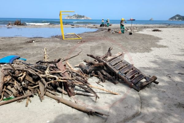 La Playa Los Cocos amaneció este jueves 26 de febrero cubierta de madera, escombros y residuos sólidos, luego del fuerte mar de fondo generado por un frente frío que afecta al Caribe colombiano.
