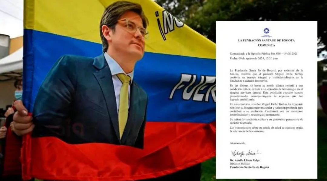 La Fundación Santa Fe de Bogotá informó este sábado 9 de agosto que el senador y precandidato presidencial Miguel Uribe Turbay volvió a un estado crítico tras una hemorragia en el sistema nervioso central, dos meses después de sobrevivir a un atentado en una plaza pública de Bogotá. En un nuevo parte médico emitido este […]