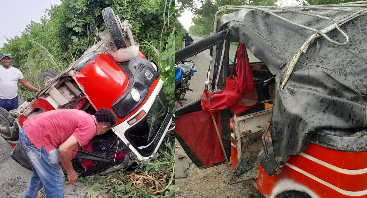 De esta forma, el motocarro que iba con tres personas a bordo, terminó volcado a un costado de la carretera.