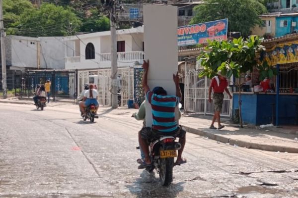 En la fotografía enviada por un conductor a nuestra línea de WhatsApp SOYINFORMADOR (310 7211581), se nota la incomodidad del parrillero por ir sosteniendo un tablón, exponiendo a que la brisa lo sacara de la motocicleta y resultara lesionado, situación que le importó poco al conductor al aceptar transportarlo sabiendo que pudo haber terminado en un accidente. ¿Hasta cuándo tantos irresponsables conduciendo por las calles y avenidas de Santa Marta? Foto derechos reservados/EL INFORMADOR