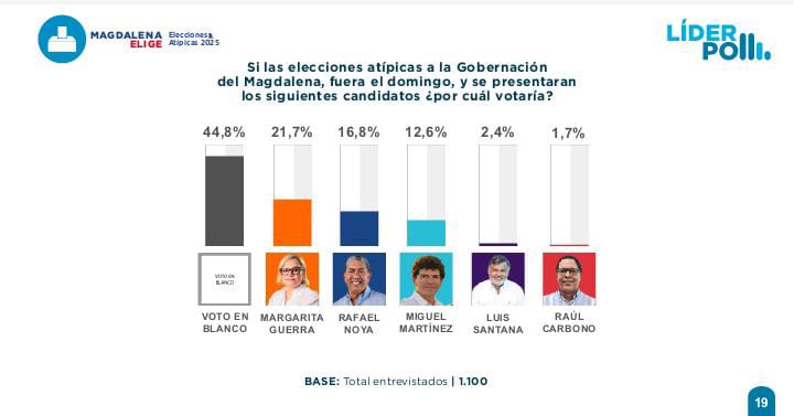 El sondeo, aplicado a 1.100 personas, refleja un cambio significativo en el comportamiento electoral. La reciente encuesta de Líder Poll muestra un panorama político inesperado en el departamento del Magdalena: el voto en blanco lidera la intención de voto con un 44,8%, seguido por Margarita Guerra con un 21,7% y Rafael Noya con un 16,8%. […]