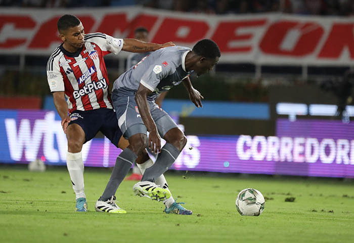 Jermein Peña acaba con el ataque de Santa Fe por izquierda con la velocidad de Luis Palacios. Junior no recupera la pelota, solo se limita a cortoar.