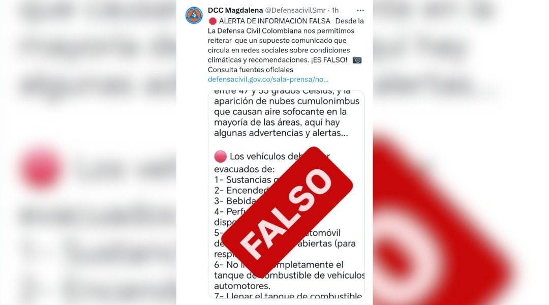 La Defensa Civil Colombiana Seccional Magdalena emitió una alerta oficial este sábado para desmentir un supuesto comunicado que circula en redes sociales, el cual advierte sobre temperaturas extremas y una serie de recomendaciones. La entidad aclara que dicho mensaje es completamente falso y no corresponde a ninguna información emitida por sus canales oficiales. El mensaje […]