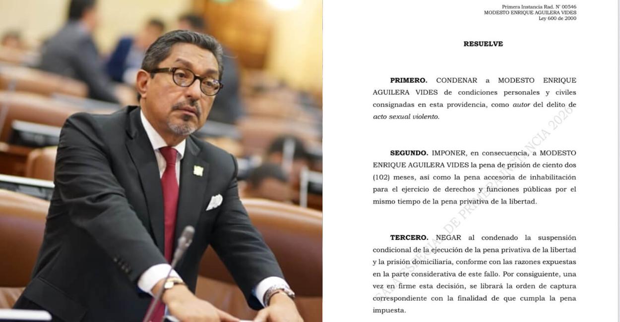Martes 10 de Marzo de 2026 – 6:08pmLa Corte Suprema de Justicia condenó al representante a la Cámara Modesto Enrique Aguilera Vides a 102 meses de prisión, es decir, ocho años y seis meses, luego de hallarlo responsable del delito de acto sexual violento. Además de esto, queda inhabilitado para ejercer derechos y funciones públicas durante el mismo periodo.