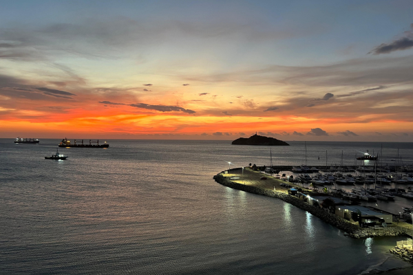 La imagen captura la majestuosidad de la Isla El Morro, testigo silenciosa de siglos de historia, y del puerto que, con sus luces encendidas, comienza a recibir la noche. Las embarcaciones reposan tranquilas, meciéndose con la brisa que lleva consigo el aroma salino y la promesa de nuevas historias por vivir.