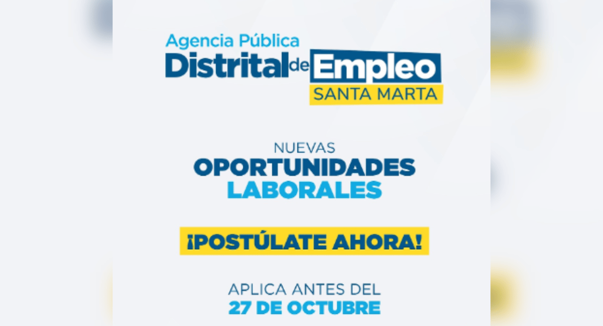 Miércoles 22 de Octubre de 2025 – 2:54pmLa Alcaldía de Santa Marta, a través de la Secretaría de Desarrollo Económico y Competitividad, informó sobre una nueva convocatoria de empleo dirigida a los ciudadanos interesados en acceder a oportunidades laborales en diferentes sectores.