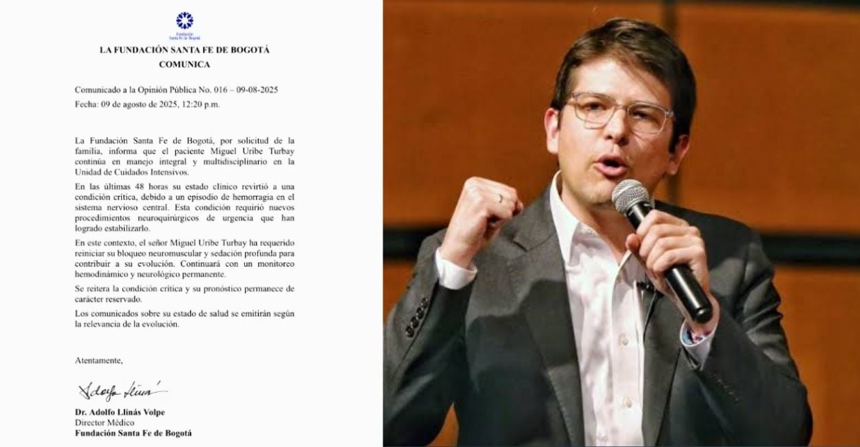 Sábado 09 de Agosto de 2025 – 3:28pmLa Fundación Santa Fe de Bogotá ha emitido un nuevo parte médico en el que informa sobre un serio deterioro en el estado de salud del senador y precandidato presidencial Miguel Uribe Turbay. Según el comunicado, en las últimas 48 horas el senador presentó una hemorragia en el sistema nervioso central, lo que revirtió su estado clínico a una «condición crítica».