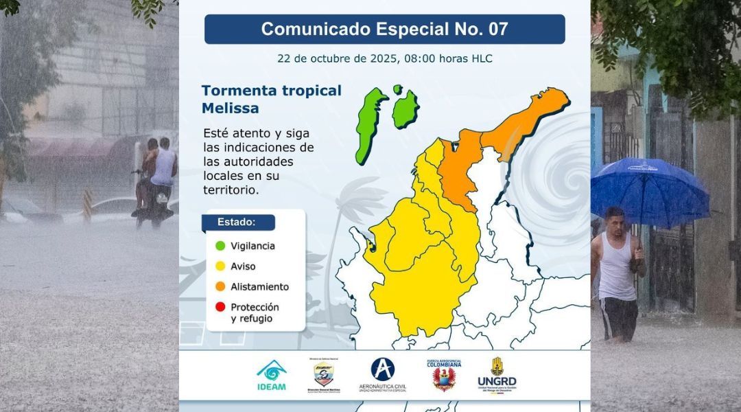 El Ideam emitió alertas por lluvias, vientos y oleaje en varios departamentos de la región Caribe. La Tormenta Tropical Melissa continúa su avance sobre el centro del mar Caribe, al norte de La Guajira, generando condiciones meteorológicas adversas en el norte del territorio colombiano. Según el Comunicado Especial No. 07 del Instituto de Hidrología, Meteorología […]