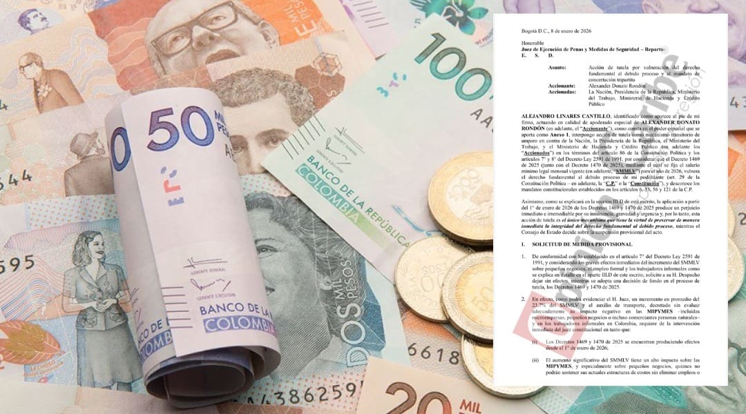 Una acción de tutela presentada ante el Juzgado de Ejecución de Penas y Medidas de Seguridad en Bogotá busca suspender provisionalmente los efectos de los decretos que fijaron el salario mínimo legal mensual vigente (SMMLV) y el auxilio de transporte para 2026, decretados por el Gobierno del presidente Gustavo Petro con un incremento del 23,78%, […]